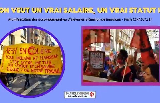 📢#AESH🎵"Jean-Michel Blanquer, ministre réactionnaire, de tes PIAL on en veut pas ! On veut un statut, on veut un salaire !"🎵Magnifique mobilisation des accompagnant·es d’élèves en situation de handicap, aujourd'hui à Paris et partout en France, pour en finir avec la précarité. pic.twitter.com/bGUmPzDna6 — Députée Obono (@Deputee_Obono) October 19, 2021 Députée Obono – Danièle Obono,…