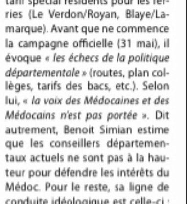 🌊Du Porge-Lacanau-Carcans-Hourtin à 🍇Margaux-Cantenac en passant par St Laurent du MédocNotre seul parti c’est le #Médoc en refusant les extrêmes! 🗞Retrouvez notre candidature #electionsdepartementales dans le @JournalduMedoc ! #Routes #Collèges #Viticulture #ClimateAction pic.twitter.com/WCryUsljDJ — Benoit Simian (@BenoitSimian) May 10, 2021 Benoit Simian – Député Girondin | Mission Hydrogène | VP Chasse Pêche Territoires l VP…