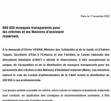 Grâce à notre initiative, coordonnée par @JFEliaou, @olivierveran et @AdrienTaquet ont demandé la #distribution de 500 000 #masques transparents pour les personnels des #crèches et des Maisons d'Assistants Maternels. Les #enfants pourront ainsi voir le visage des adultes! pic.twitter.com/dtpBxad0SN — Lau VANCEUNEBROCK (@LaurenceVanceu) November 18, 2020 Lau VANCEUNEBROCK – Députée de l’#Allier #circo0302 #Montluçon #LREM…