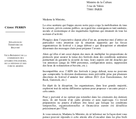 Des solutions alternatives sont possibles pour les #festivals « à jauge debout ». Encore faut-il qu'un cadre pérenne et sans équivoque soit donné par le @MinistereCC. C'est le sens de mon courrier à Mme la ministre @R_Bachelot cc @prodiss @eurockeennes pic.twitter.com/TGoOWavvbp — Cédric Perrin (@cperrin90) April 11, 2021 Cédric Perrin – Sénateur du Terr. de…