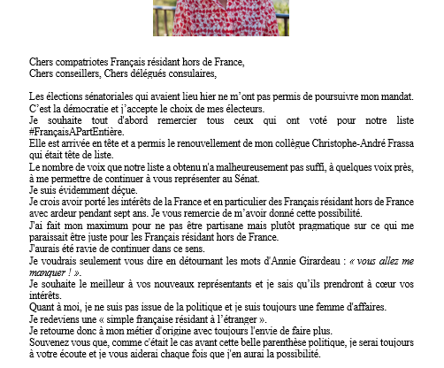 Les élections #sénatoriales qui avaient lieu hier ne m'ont pas permis de poursuivre mon mandat.↪️Mon message d'au revoir.#francaisdeletranger pic.twitter.com/ixII6brgLd — Jacky Deromedi (@jacky_deromedi) September 27, 2021 Jacky Deromedi – Sénateur représentant les Français établis hors de France