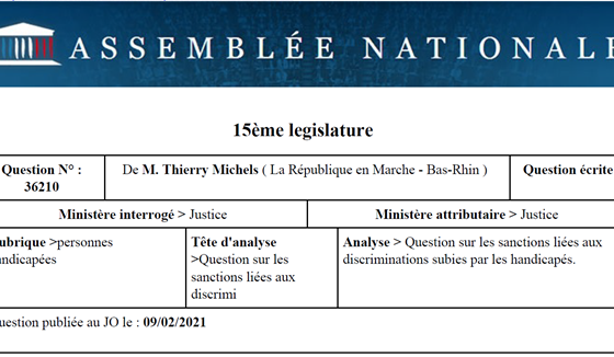 J’ai posé aujourd’hui une question écrite au ministre de la Justice @E_DupondM ➡️Quelles réelles sanctions pour les personnes coupables de discriminations liées au handicap ? Ensemble construisons une véritable société inclusive #HandiVoice 💪 Lien : https://t.co/zZFCwF2vHA pic.twitter.com/wgkQhtD9oZ — Thierry Michels (@ThierryMichels) February 9, 2021 Thierry Michels – Député #LaREM de la 1ère circonscription du Bas-Rhin.…