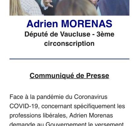 [#COVID19] Retrouvez ci-dessous mon communiqué de presse ⤵️ 📢 Je demande au @gouvernementFR le versement d’une indemnité pour les #libéraux ayant moins d’un an d’existence pour faire face aux conséquences financières dûes au #Coronavirus #Covid-19 📢 pic.twitter.com/FzKZOmYWAE — Adrien MORENAS (@AdrienMorenas) March 24, 2020 Adrien MORENAS – Député #LREM de #Vaucluse – VP @AN_DevDur –…