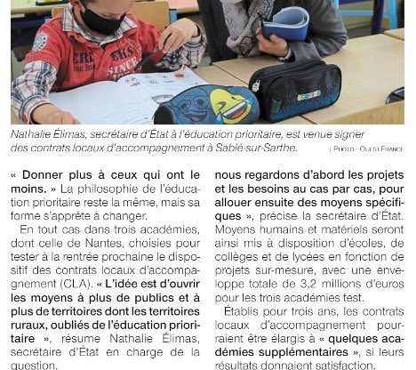 🗞 Retours sur mon déplacement dans l’@acnantes cette semaine : 📍#Angers et la #CitéEducative de Monplaisir 📍#SabléSurSarthe et ses deux écoles orphelines bénéficiant d’un contrat local d’accompagnement via @OuestFrance @courrierouest @lemainelibre pic.twitter.com/xPLHrCCgfP — Nathalie Elimas (@avyelimas) May 27, 2021 Nathalie Elimas – Secrétaire d’Etat chargée de l’Education prioritaire