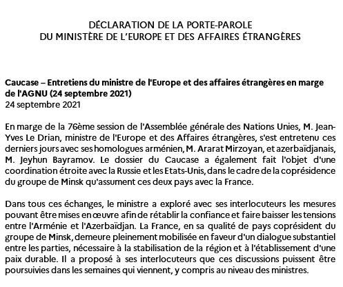 #Caucase J’ai évoqué les tensions actuelles avec les ministres arménien, azerbaïdjanais, russe et américain. La rencontre entre les ministres 🇦🇲 et 🇦🇿 intervenue hier, un an après la guerre, est un geste positif. Notre mobilisation pour une paix durable est entière.#UNGA pic.twitter.com/uO5cz51JHe — Jean-Yves Le Drian (@JY_LeDrian) September 24, 2021 Jean-Yves Le Drian – Compte…