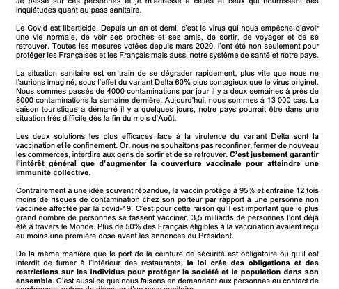 Ma position sur le projet de loi portant sur la gestion de la crise sanitaire qui sera examiné cette semaine au Parlement.#Passanitaire #VaccinObligatoire pic.twitter.com/330eEkOSyU — Nicole Trisse (@NicoleTrisse) July 19, 2021 Nicole Trisse – Députée de la Moselle – Sarreguemines, Sarralbe & Pays de Bitche – @AN_AfSoc – Présidente de la délégation française à l’APCE…